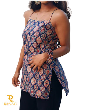 Elevate your everyday style with this sleeveless indigo printed kurti, crafted from breathable cotton for all-day comfort. Designed with a chic straight cut, thin straps, and intricate traditional motifs, this kurti blends modern elegance with ethnic charm. Perfect for casual outings, festive gatherings, or office wear, it pairs beautifully with palazzos, jeans, or skirts. Handcrafted with care to bring you timeless fashion from Revati.